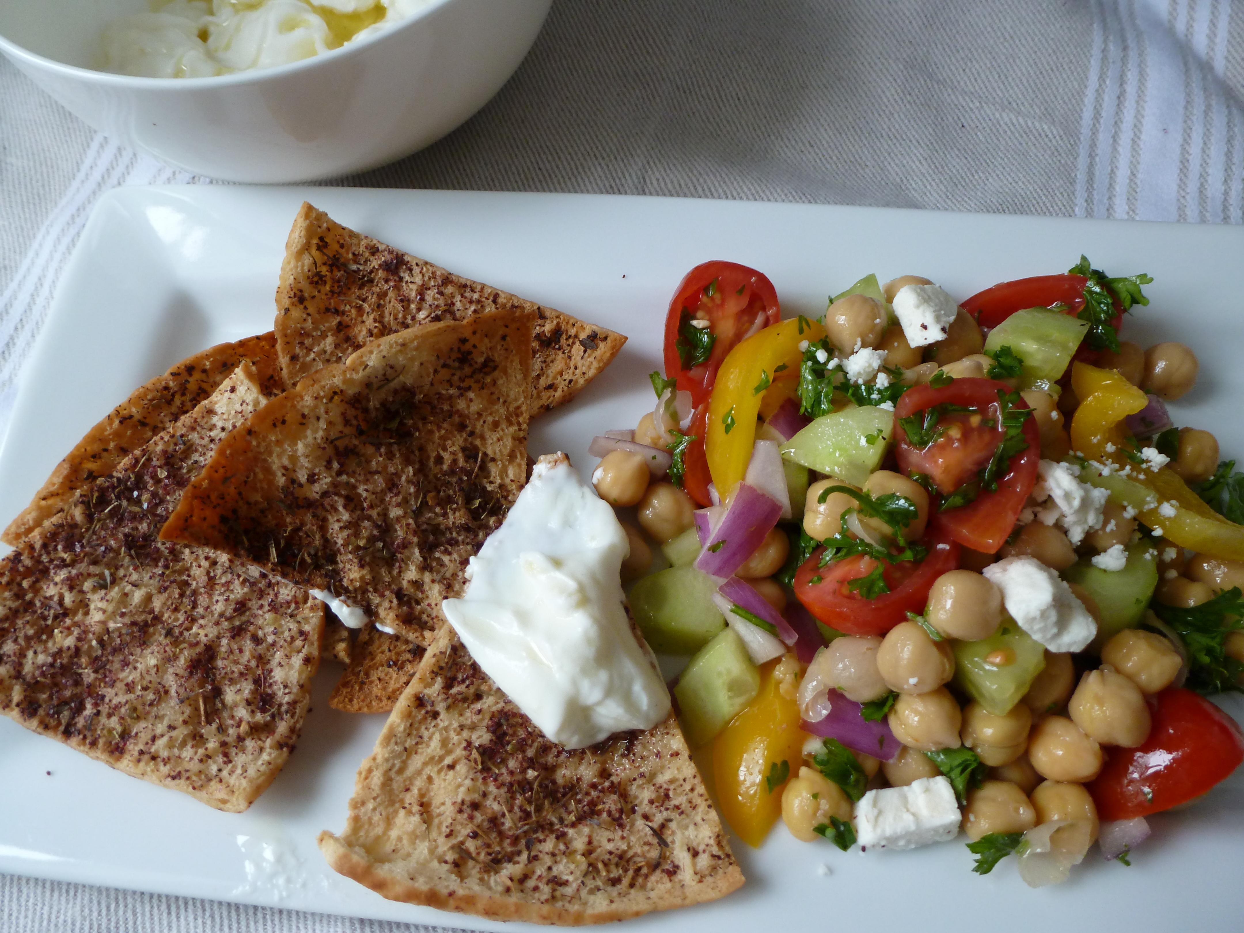 I love za’atar on pita chips. I split pita into 2 rounds (I use scissors to cut around the edges) and brush a very light coating of olive oil on the rough sides of the pita. I sprinkle za’atar all over the surface, then cut the rounds into triangles to make chips. I bake them at 350 degrees for 7 minutes or so, or until golden. These are spectacular served alongside chickpea salad with feta and some labneh or tzatziki.