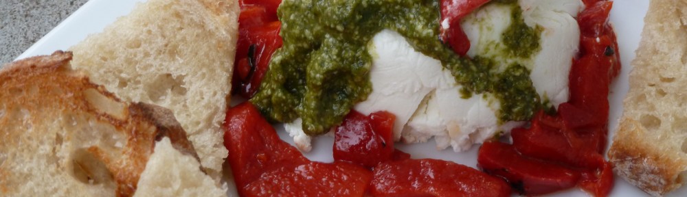 This delicious concoction is a breeze to assemble, especially if you have pesto in your freezer like I often do. It is a combination of four of my favorite foods:goat cheese, pesto, and marinated roasted red peppers, and chewy Tuscan bread.