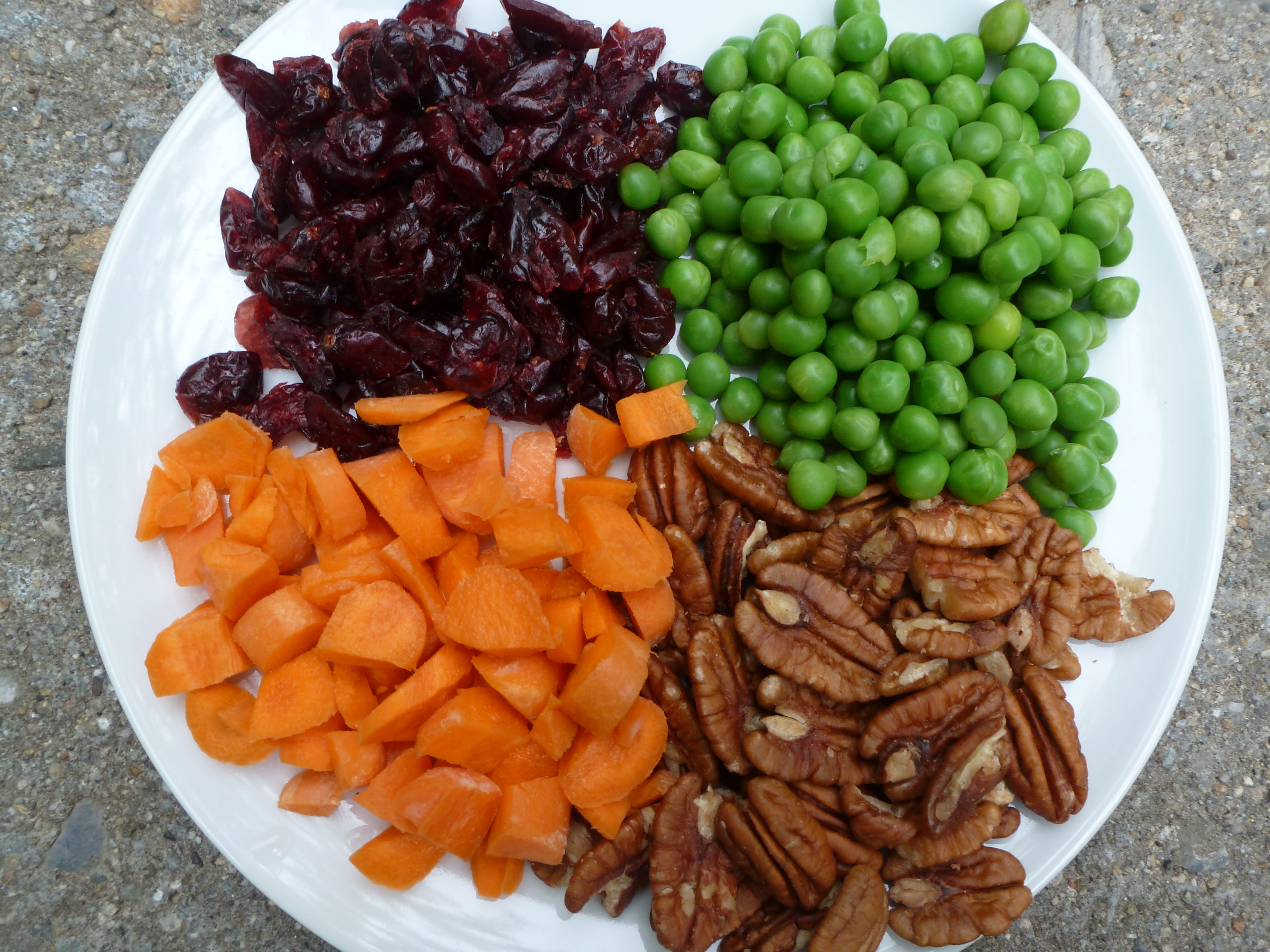 3. When the quinoa is barely warm mix in the pecans, cranberries, and peas. Pour on all the dressing and coat everything well. Cover and chill a few hours before serving.
