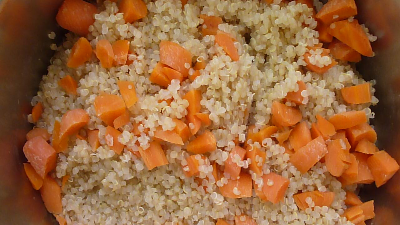 1. Bring the water and salt to a boil in a medium-size saucepan. Add the quinoa and cover the pan. Reduce the heat to a simmer. Cook until most the water is absorbed, about 15 minutes. Sprinkle the carrots on top of the quinoa (do not stir), cover the pan, and finish cooking about 3 more minutes. This will soften the carrots slightly but still keep their texture. Scoop the cooked quinoa into a large bowl and let cool.