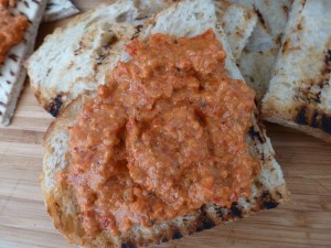 Surrounding muhammara with hot pita bread is customary, but I suggest you find a good sourdough or other chewy, crusty bread to toast or grill, and use it as a base for the muhammara and you will be paid off in dividends. I like to toast slices of ciabatta, rub them with a clove of garlic that has been sliced in half, and then brush them lightly with olive oil before I arrange them on a plate or in a basket. I know that the muhammara already is infused with garlic and olive oil, but the extra dose on the toasted or grilled bread is the embodiment of perfection.