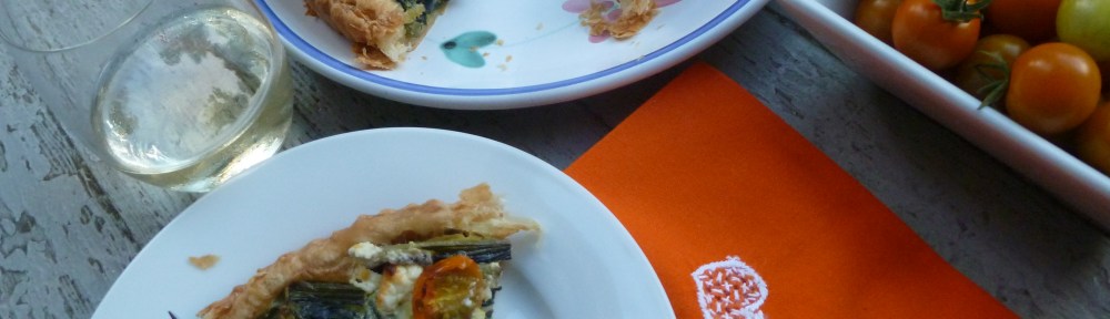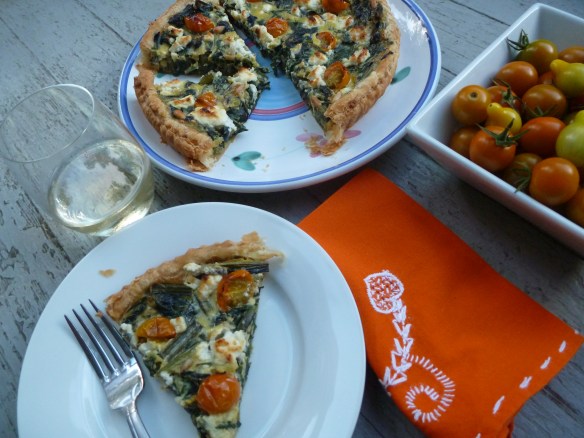 For many cooks the idea of making a tart seems a daunting task – especially during the summer. Who wants to spend hours in the kitchen when a hot sunny day beckons you outside. But since I am so fond of vegetable tarts and want to take advantage of the abundance of vegetables this season – in this case Swiss chard – I have developed a quick way to construct fabulous tarts using store-bought puff pastry. If you have enough time to saute the chard, then you can handle this easy recipe.